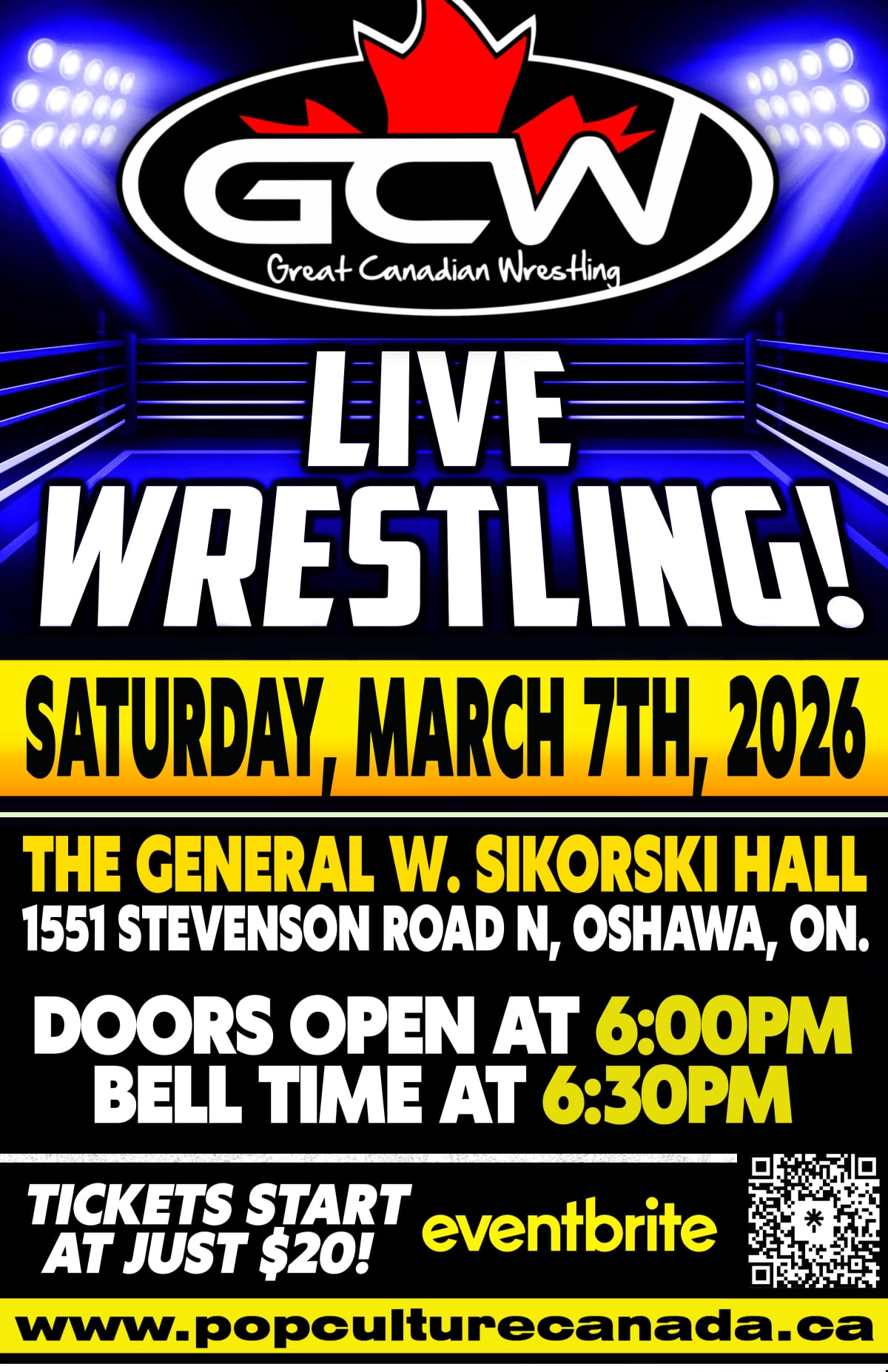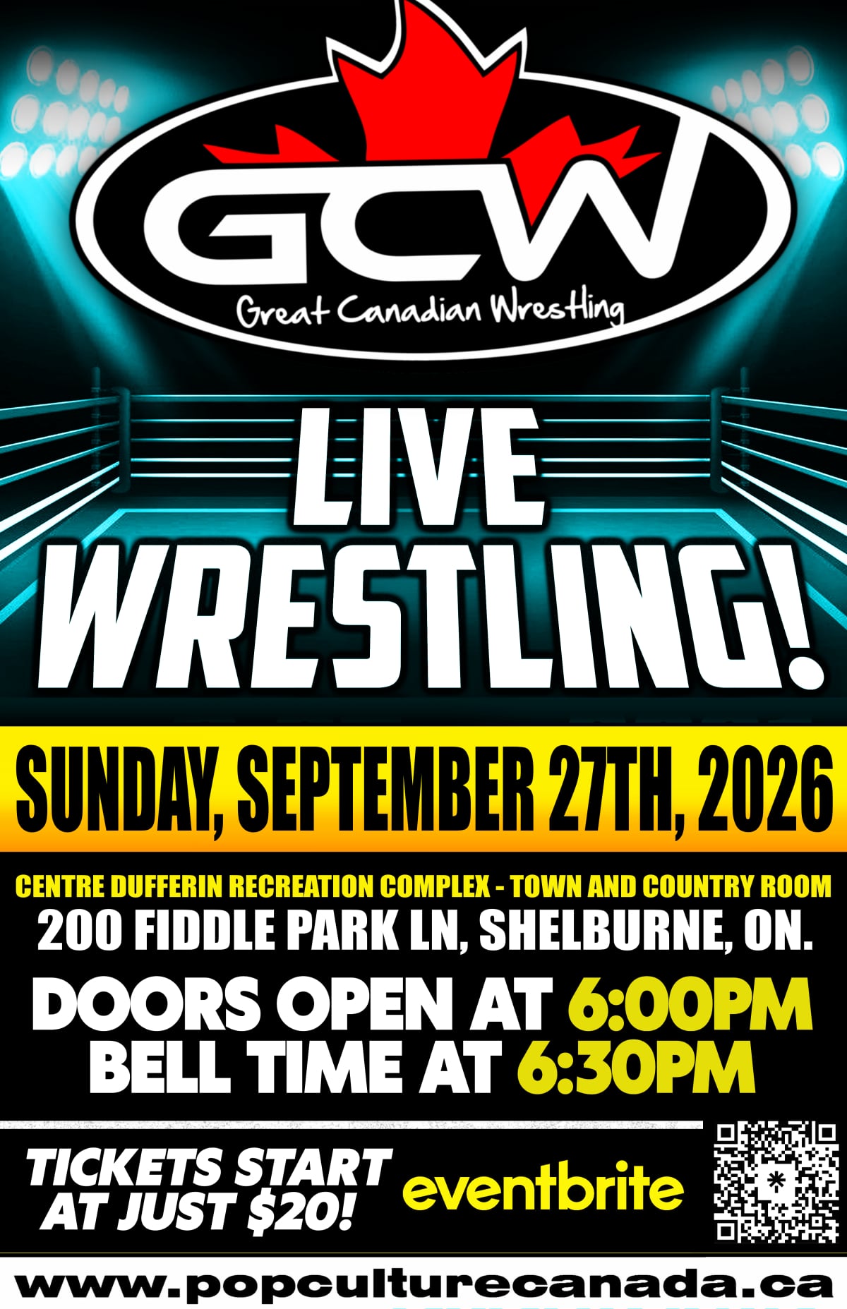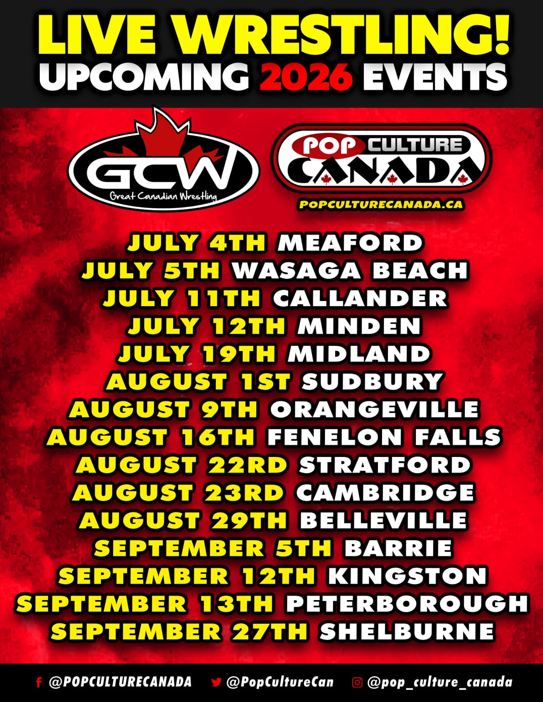 Live wrestling is coming to Ontario in a big way in 2026 as Great Canadian Wrestling (GCW) teams up with Pop Culture Canada to bring hard-hitting, family-friendly action to cities across the province. From Peterborough and Aurora to Brampton, Burlington, Cambridge, and beyond, fans will experience the sights, sounds, and intensity of live professional wrestling up close. Expect high-flying moves, powerful slams, larger-than-life personalities, and nonstop excitement that you can’t get from watching on a screen.