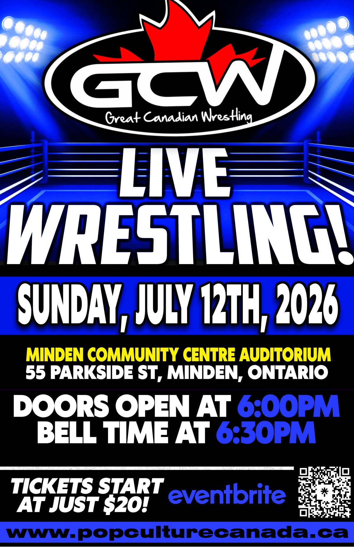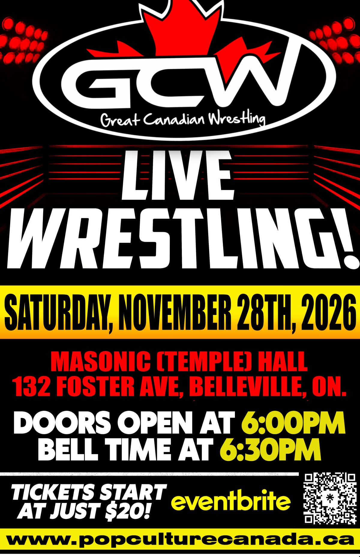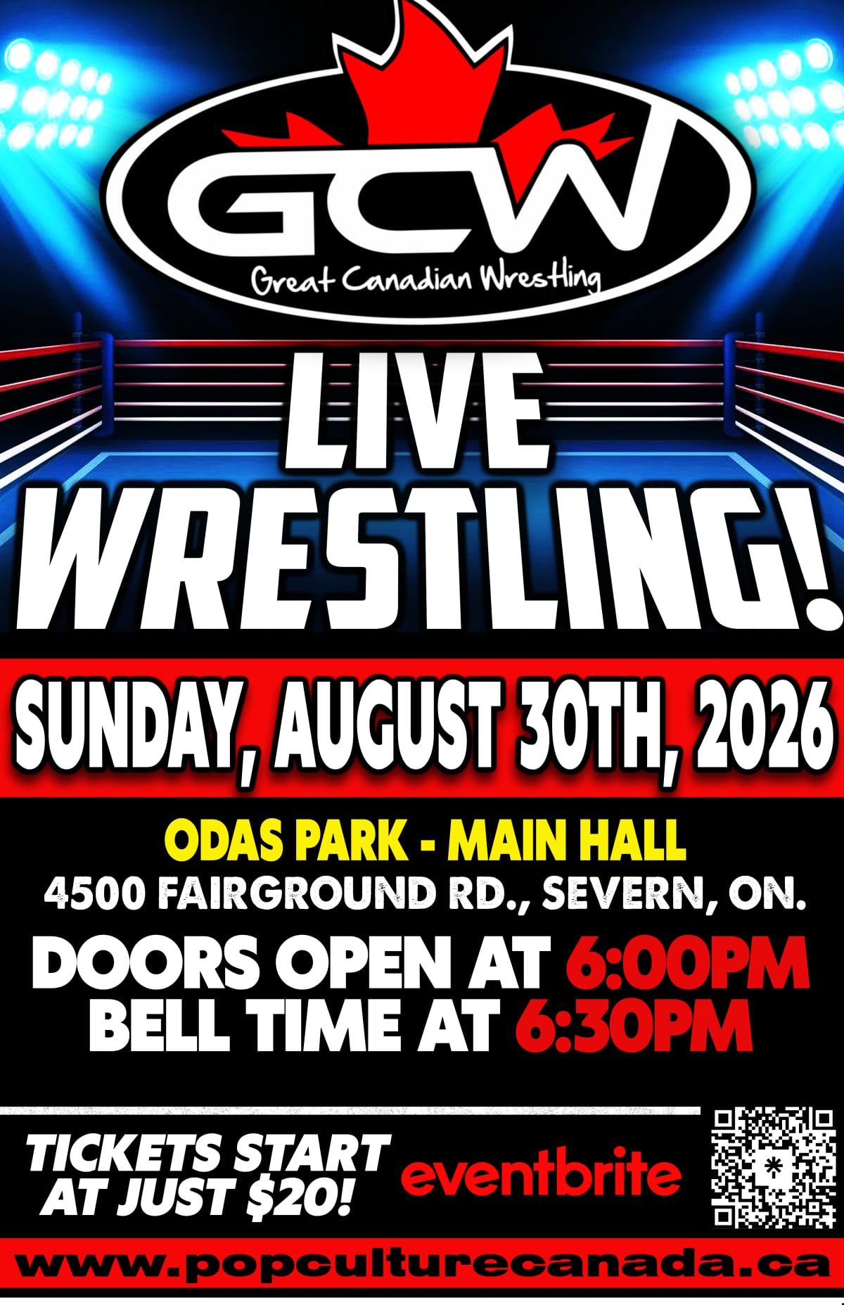 Live wrestling is coming to Ontario in a big way in 2026 as Great Canadian Wrestling (GCW) teams up with Pop Culture Canada to bring hard-hitting, family-friendly action to cities across the province. From Peterborough and Aurora to Brampton, Burlington, Cambridge, and beyond, fans will experience the sights, sounds, and intensity of live professional wrestling up close. Expect high-flying moves, powerful slams, larger-than-life personalities, and nonstop excitement that you can’t get from watching on a screen.