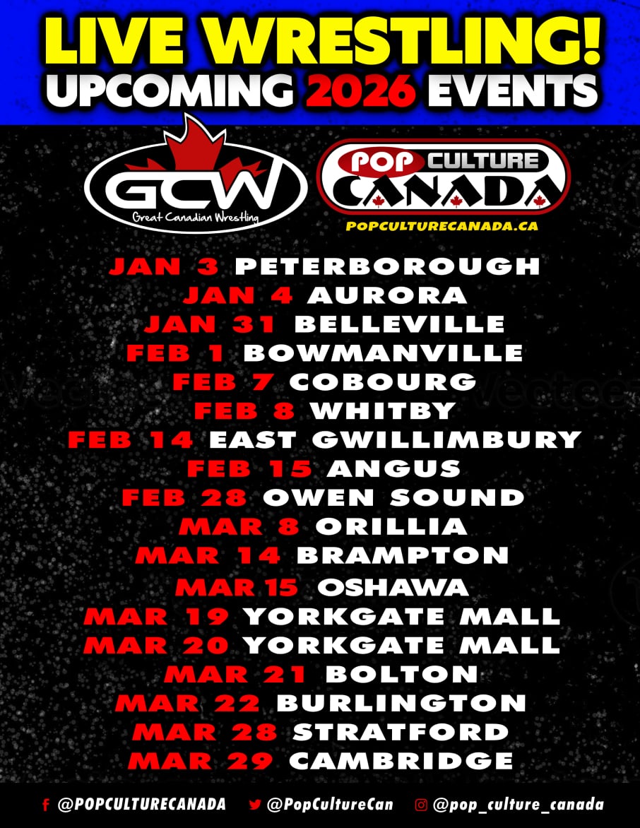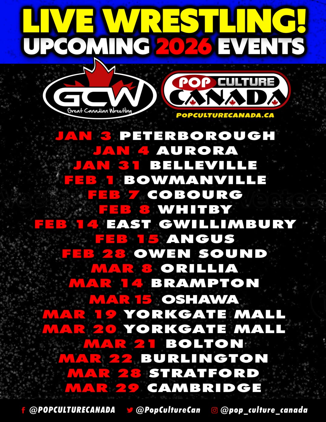 Whether you’re a lifelong wrestling fan or discovering it for the first time, these events deliver unforgettable entertainment for all ages. Catch GCW stars live at malls and venues throughout January, February, and March 2026, including multiple stops at Yorkgate Mall and appearances in communities big and small. Follow @PopCultureCanada for dates, details, and updates—and get ready to feel the energy, because GCW live wrestling is rolling into your town.